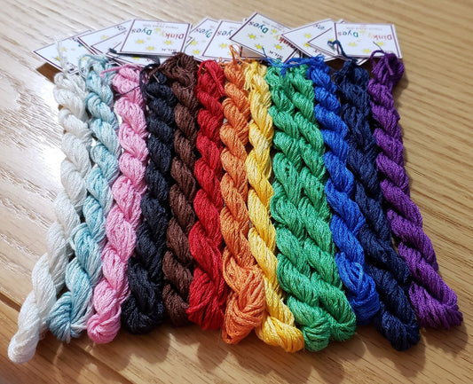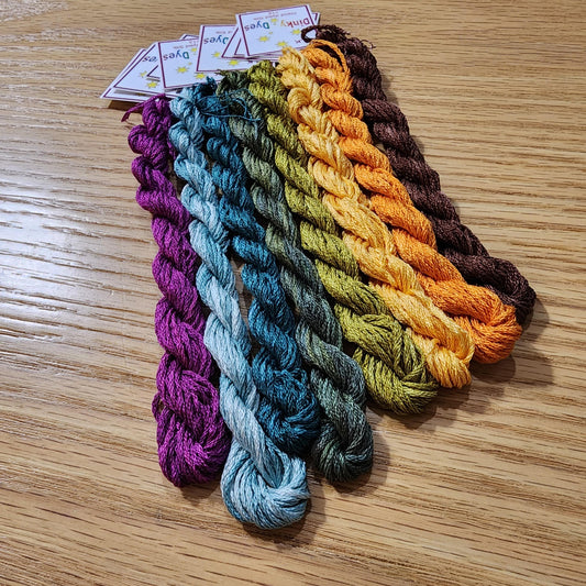 Dinky Dyes uses the best quality 6 stranded spun silk to create the wonderfully unique colors. The silk is manufactured to Dinky Dyes' own specifications in Asia. Each stranded skein of silk is approximately 8m in length.