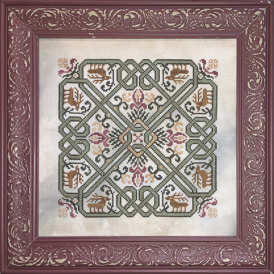 Gentle deer wander about the narrow paths winding through the trees and flowers in this Celtic design. It was stitched with Classic Colorworks threads on Mystic Fabric's 28 count Olympia linen. Size is 121 stitches square.